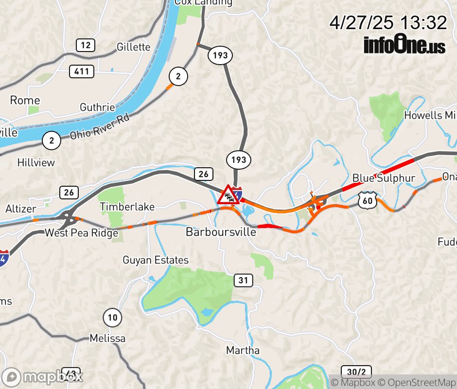 In Cabell County there is a Congestion-Delay on I-64E at Mile Marker 18. ![]() |