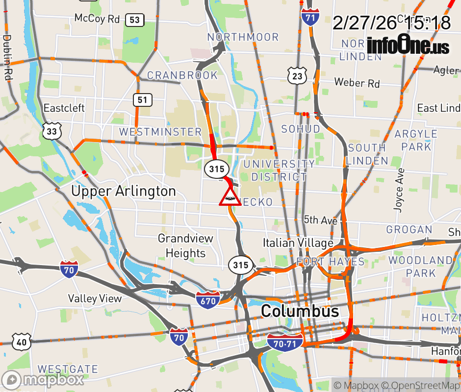 The right lane is blocked on SR-315 South beyond Kinnear Rd/Olentangy Rd, due to a crash. Updated: Fri 2/27/26 3:18 PM EST ![]() Updated: Fri 2/27/26 3:18 PM EST |