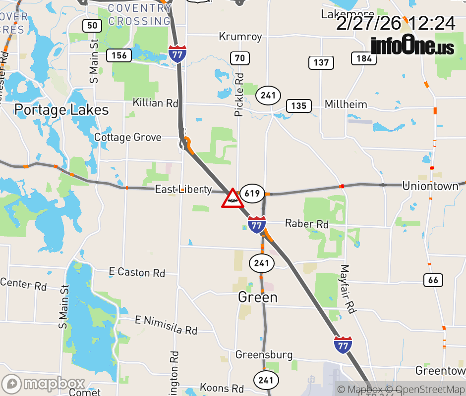 The 2 right lanes are blocked on I-77 North beyond SR-241/Massillon Rd, due to a crash. ![]() |