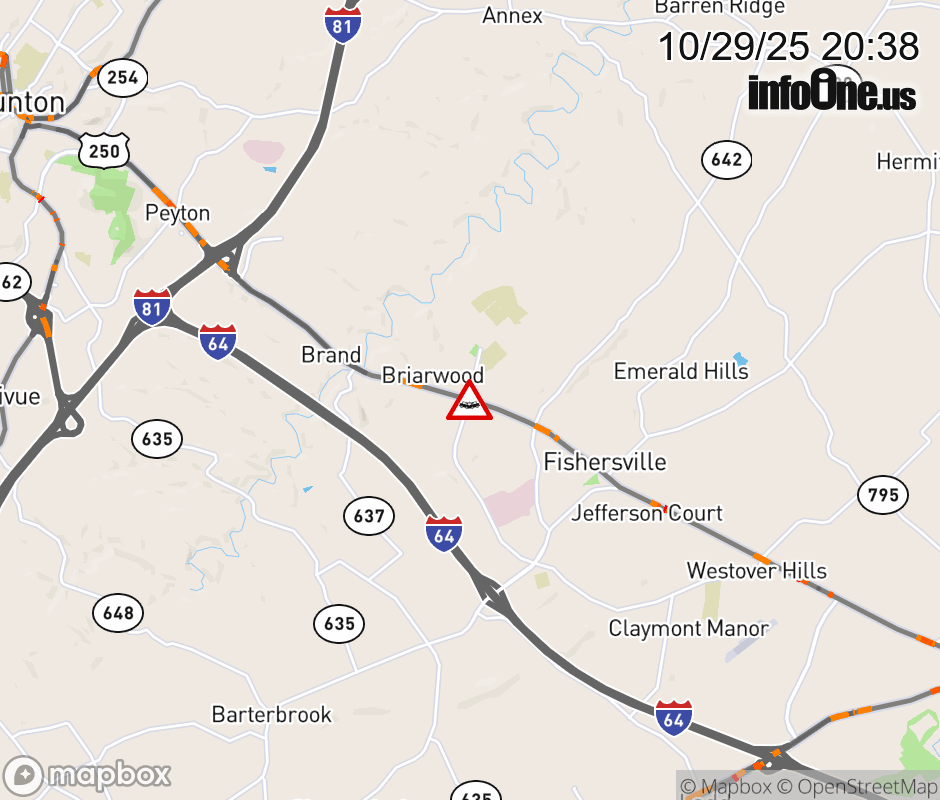 On US-250 in the County of Augusta, in the vicinity of Woodrow Wilson Ave; VA-358N/S, motorists can expect delays due to a vehicle crash. The west right lane and right shoulder are closed. ![]() |