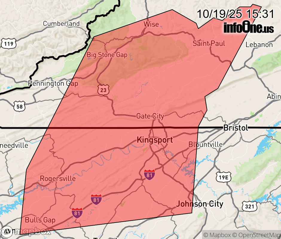 Canceled 10/19/25 4:15 PM Special Weather Statement issued October 19 at 3:28PM EDT by NWS Morristown TN At 328 PM EDT, Doppler radar was tracking strong thunderstorms along a line extending from near Big Stone Gap to near Rogersville to near Russellville. Movement was east at 40 mph. HAZARD...Wind gusts up to 50 mph. SOURCE...Radar indicated. IMPACT...Gusty winds could knock down tree limbs and blow around unsecured objects. Locations impacted include... Johnson City, Kingsport, Rogersville, Norton, Wise, Gate City, Big Stone Gap, Jonesborough, Surgoinsville, and Weber City. ![]() |