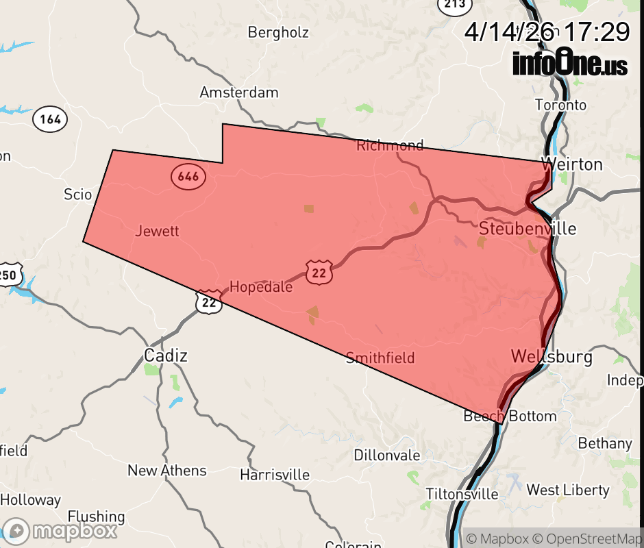 Canceled 4/14/26 5:42 PM Severe Thunderstorm Warning issued April 14 at 5:28PM EDT until April 14 at 6:00PM EDT by NWS Pittsburgh PA At 528 PM EDT, a severe thunderstorm was located 9 miles north of Cadiz, moving east at 35 mph. HAZARD...60 mph wind gusts and half dollar size hail. SOURCE...Radar indicated. IMPACT...Hail damage to vehicles is expected. Expect wind damage to roofs, siding, and trees. Locations impacted include... Steubenville, Wellsburg, Wintersville, Mingo Junction, Hopedale, Smithfield, Jewett, Beech Bottom, Brilliant, Richmond, New Alexandria, Bloomingdale, Unionport and Brentwood. ![]() |