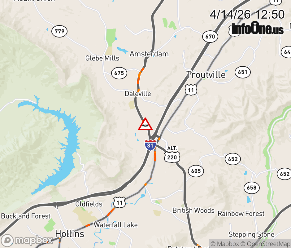 On US-220 South in the County of Botetourt, in the vicinity of Commons Pkwy; Wesley Rd; Rt. 653E/W (Botetourt County), motorists can expect delays due to a vehicle crash. Lane closures exist. ![]() |
