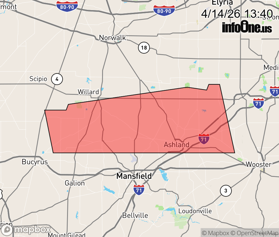 Canceled 4/14/26 2:03 PM Severe Thunderstorm Warning issued April 14 at 1:39PM EDT until April 14 at 2:30PM EDT by NWS Cleveland OH SVRCLE The National Weather Service in Cleveland has issued a * Severe Thunderstorm Warning for... Southwestern Huron County in north central Ohio... Northern Richland County in north central Ohio... Southwestern Medina County in northeastern Ohio... Northern Ashland County in north central Ohio... Northeastern Crawford County in north central Ohio... Northwestern Wayne County in northeastern Ohio... * Until 230 PM EDT. * At 139 PM EDT, a severe thunderstorm was located near New Washington, or 11 miles northeast of Bucyrus, moving east at 55 mph. HAZARD...60 mph wind gusts and quarter size hail. SOURCE...Radar indicated. IMPACT...Minor damage to vehicles is possible. Expect damage to trees and power lines. * Locations impacted include... Ashland, Shelby, Plymouth, West Salem, New Washington, Savannah, Polk, Sullivan, Greenwich, Bailey Lakes, Tiro, Rowsburg, Nova, Sulpher Springs, Nankin, Shenandoah, and Olivesburg. ![]() |