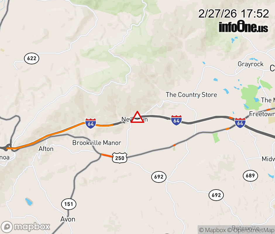 On I-64 West at mile marker 104 in the County of Albemarle, motorists can expect delays due to a multi-vehicle crash. Updated: Fri 2/27/26 5:52 PM EST ![]() Updated: Fri 2/27/26 5:52 PM EST |