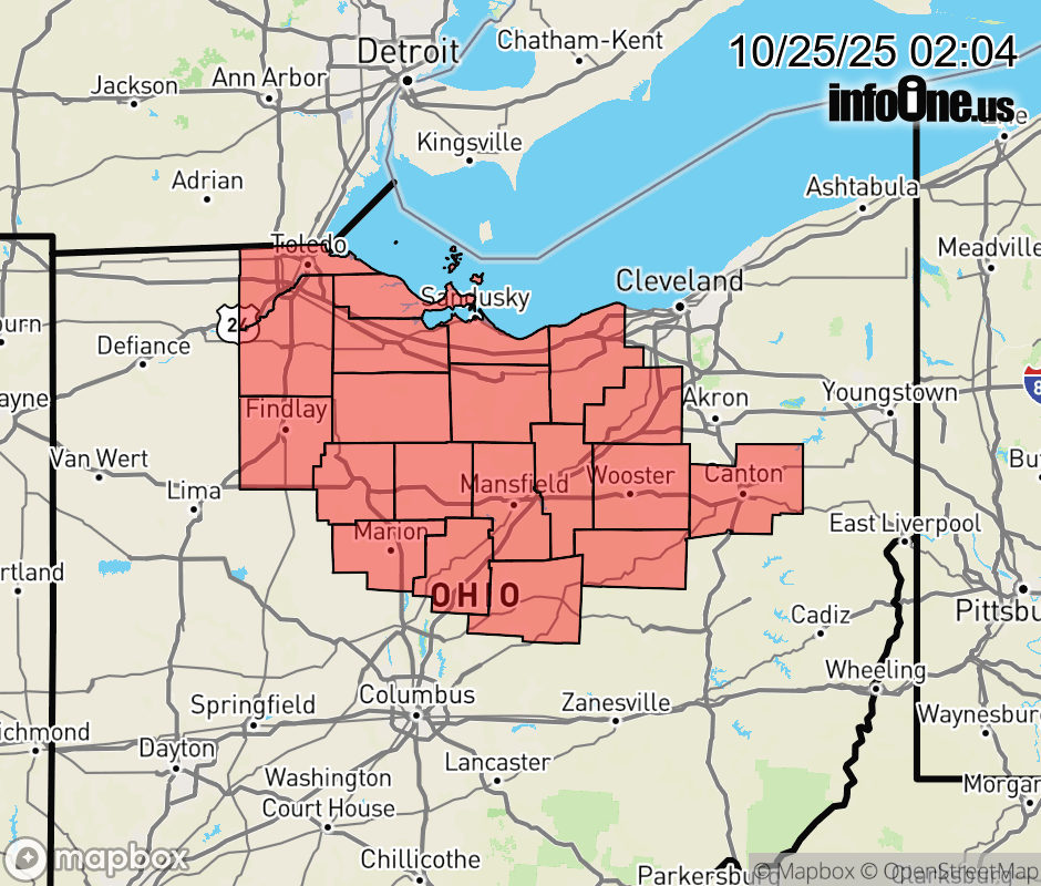 Canceled 10/25/25 9:00 AM Freeze Warning issued October 25 at 2:01AM EDT until October 25 at 9:00AM EDT by NWS Cleveland OH * WHAT... Sub-freezing temperatures as low as 30. * WHERE... Portions of north central, northeast, and northwest Ohio. * WHEN... Until 9 AM EDT this morning. * IMPACTS... Frost and freeze conditions could kill crops, other sensitive vegetation and possibly damage unprotected outdoor plumbing. ![]() |