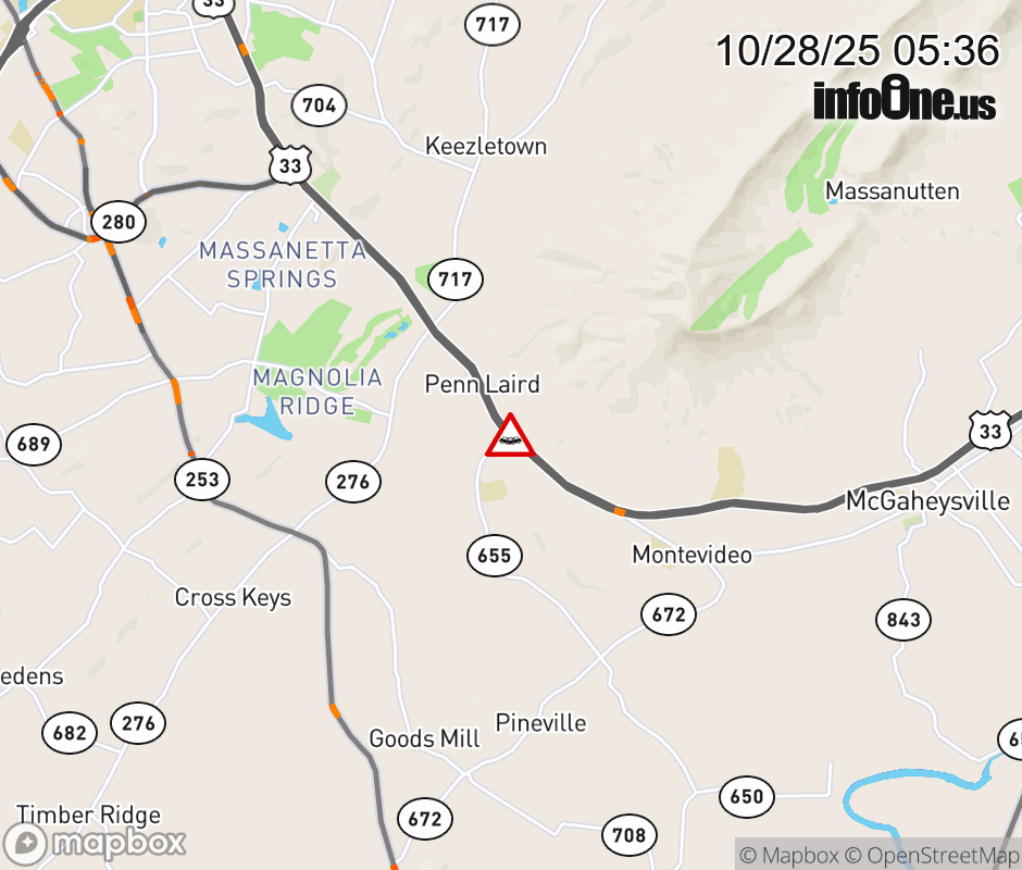 On US-33 in the County of Rockingham, in the vicinity of Penn Laird Dr; Rt. 655E/W (Rockingham County), motorists can expect delays due to a vehicle crash. The west right lane and right shoulder are closed. ![]() |