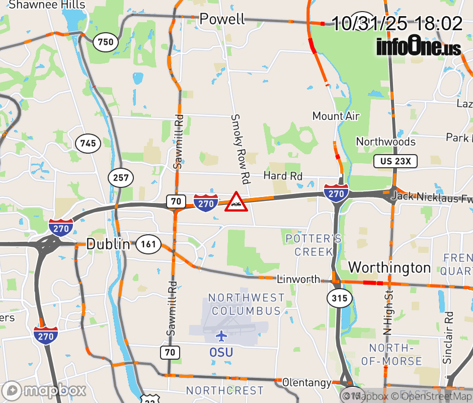 The right lane is blocked on I-270 West beyond SR-315 South, due to a disabled vehicle. Updated: Fri 10/31/25 6:02 PM EDT ![]() Updated: Fri 10/31/25 6:02 PM EDT |