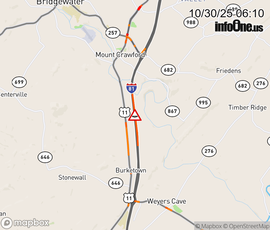 On I-81 North at mile marker 238 in the County of Rockingham, motorists can expect delays due to a tractor trailer crash. Traffic backups are approximately 1.0 mile. Updated: Thu 10/30/25 6:10 AM EDT ![]() Updated: Thu 10/30/25 6:10 AM EDT |