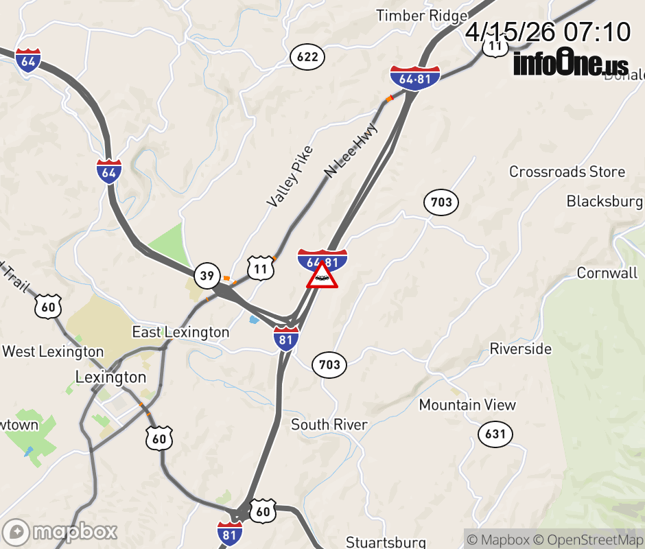 On I-81 at mile marker 192.2 in the County of Rockbridge, motorists can expect delays due to a tractor trailer crash. The north right shoulder is closed. ![]() |