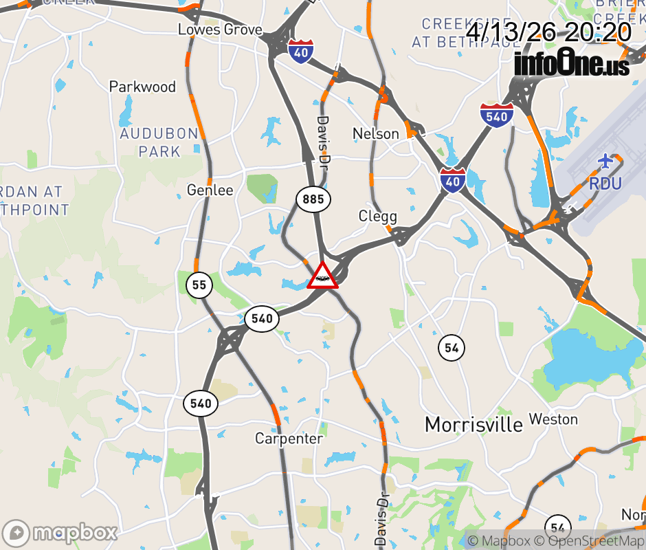 The left ramp shoulder is closed on Exit 1 (NC540). Updated: Mon 4/13/26 8:20 PM EDT ![]() Updated: Mon 4/13/26 8:20 PM EDT |