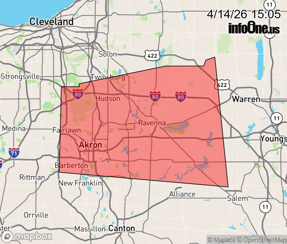 Canceled 4/14/26 3:45 PM Special Weather Statement issued April 14 at 3:04PM EDT by NWS Cleveland OH At 304 PM EDT, Doppler radar was tracking a strong thunderstorm over Cuyahoga Falls, or near Akron, moving east at 45 mph. HAZARD...Wind gusts of 50 to 55 mph. SOURCE...Radar indicated. IMPACT...Gusty winds could knock down tree limbs and blow around unsecured objects. Locations impacted include... Akron, Ravenna, Cuyahoga Falls, Kent, Barberton, Green, Hudson, Twinsburg, Tallmadge, Streetsboro, Macedonia, Newton Falls, Mogadore, Hartville, Garrettsville, Mantua, Stow, Aurora, Brecksville, and Norton. ![]() |