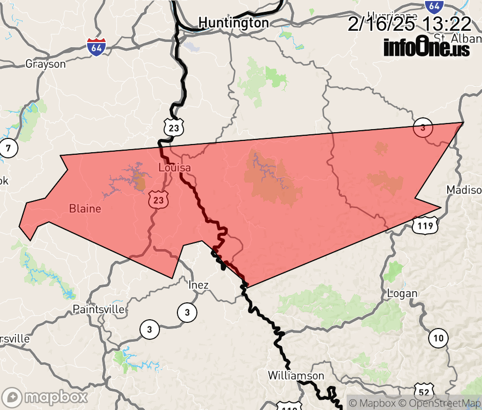 Canceled 2/16/25 5:49 PM Flood Warning issued February 16 at 1:21PM EST until February 16 at 6:00PM EST by NWS Charleston WV * WHAT... Flooding caused by excessive rainfall continues. * WHERE... Portions of northeast Kentucky, including the following county, Lawrence and West Virginia, including the following counties, Boone, Lincoln, Logan, Mingo and Wayne. * WHEN... Until 600 PM EST. * IMPACTS... Flooding of rivers, creeks, streams, and other low-lying and flood-prone locations is imminent or occurring. Numerous roads remain closed due to flooding. * ADDITIONAL DETAILS... - At 121 PM EST, gauge reports indicated heavy rain. Flooding is ongoing in the warned area. Between 1.5 and 2.5 inches of rain have fallen. - Flooding impacts will continue, but no additional rainfall is expected. - Some locations that will experience flooding include... Louisa, Blaine, Yatesville Lake State Park, Fort Gay, Dunlow, Kiahsville, East Lynn Lake, Ranger, Harts, Gill, Ulysses, Charley, Spurlockville, Martha, Genoa, Glenhayes, East Lynn, Clifford, Wilsondale and Crum. - http://www.weather.gov/safety/flood ![]() |