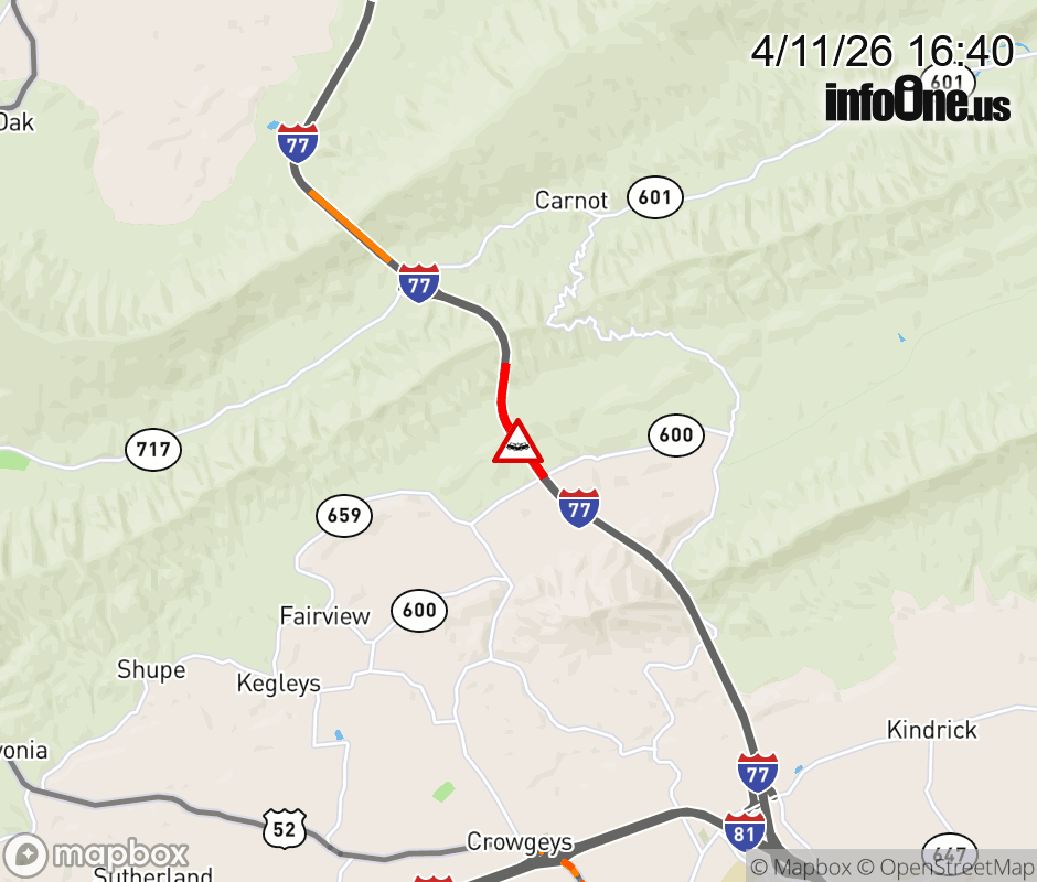 On I-77 at mile marker 45.6 in the County of Wythe, motorists can expect delays due to a vehicle crash. The north right shoulder is closed. Updated: Sat 4/11/26 4:40 PM EDT ![]() Updated: Sat 4/11/26 4:40 PM EDT |