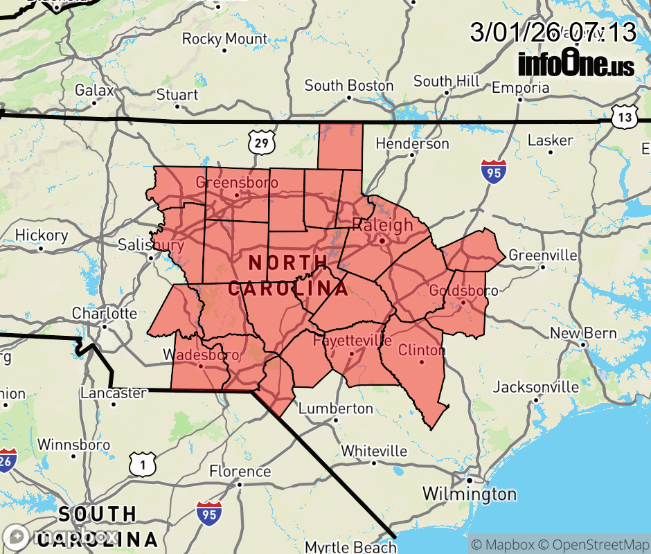 Canceled 3/1/26 9:34 AM Dense Fog Advisory issued March 1 at 7:12AM EST until March 1 at 10:00AM EST by NWS Raleigh NC * WHAT... Visibility one quarter mile or less in dense fog. * WHERE... Piedmont, Sandhills, southern Coastal Plain. * WHEN... Until 10 AM EST this morning. * IMPACTS... Low visibility could make driving conditions hazardous. ![]() |