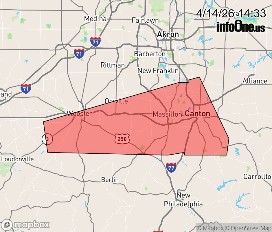 Canceled 4/14/26 3:15 PM Special Weather Statement issued April 14 at 2:32PM EDT by NWS Cleveland OH At 232 PM EDT, Doppler radar was tracking a strong thunderstorm near Shreve, or 7 miles south of Wooster, moving east at 45 mph. HAZARD...Wind gusts of 50 to 55 mph and penny size hail. SOURCE...Radar indicated. IMPACT...Gusty winds could knock down tree limbs and blow around unsecured objects. Minor hail damage to vegetation is possible. Locations impacted include... Canton, Wooster, Massillon, Green, North Canton, Orrville, Brewster, Navarre, Dalton, Shreve, Waynesburg, East Sparta, Wilmot, Mount Eaton, Canal Fulton, East Canton, Apple Creek, Beach City, Meyers Lake, and Fredericksburg. ![]() |
