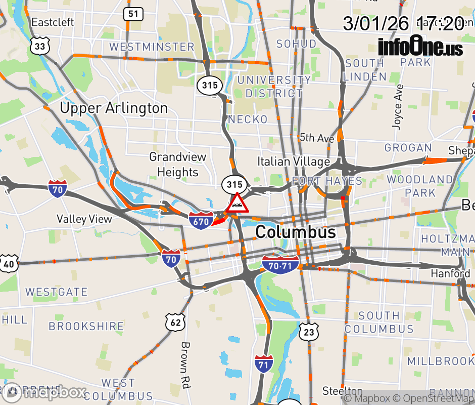 The left lane is blocked on I-670 East beyond SR-315 North, due to a disabled vehicle. Updated: Sun 3/1/26 5:20 PM EST ![]() Updated: Sun 3/1/26 5:20 PM EST |