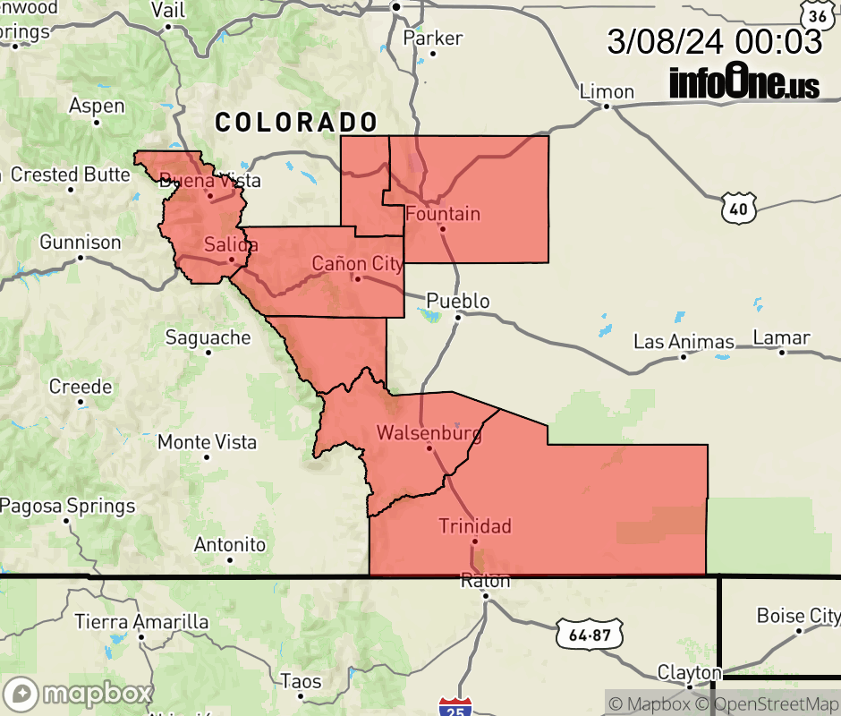 Canceled 3/8/24 4:58 AM Winter Weather Advisory issued March 7 at 10:02PM MST until March 8 at 11:00PM MST by NWS Pueblo CO * WHAT... Snow. Additional snow accumulations of 3 to 6 inches. * WHERE... Western Chaffee County Between 9000 and 11000 Feet and Central Chaffee County Below 9000 Feet. Teller, Northern El Paso, Huerfano, western Las Animas, and Fremont counties, along with the Wet Mountain Valley. * WHEN... Until 11 PM MST Friday. * IMPACTS... Plan on slippery road conditions. The hazardous conditions could impact the morning or evening commute. ![]() |
