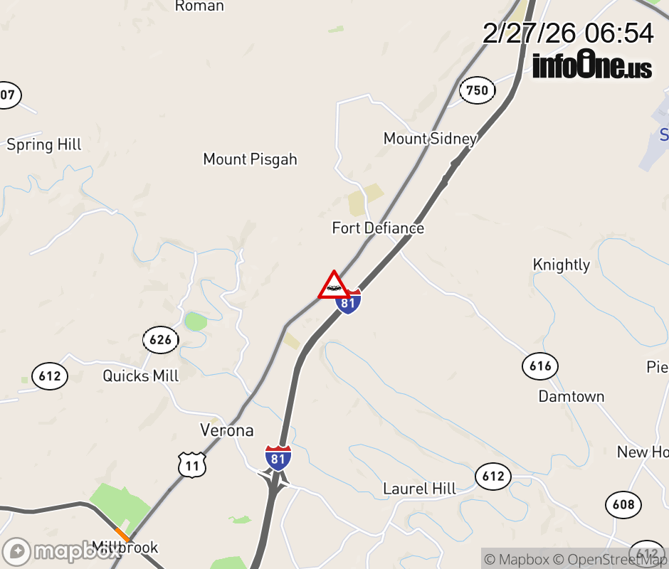 On US-11 in the County of Augusta, in the vicinity of Captain Hizer Ln, motorists can expect delays due to a vehicle crash. All south lanes are closed. Updated: Fri 2/27/26 6:54 AM EST ![]() Updated: Fri 2/27/26 6:54 AM EST |